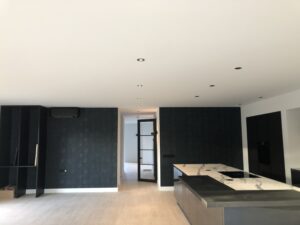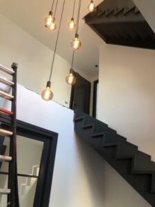 De prefab kap is afgewerkt met een antraciet vlakke dakpan. Op zolder is een geïsoleerd dakluik aangebracht voor eventuele service en onderhoud aan in buitenunits die op het hoge dak staan.