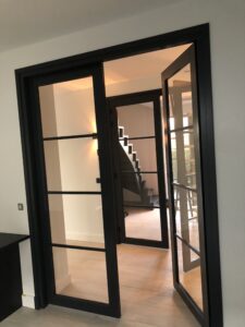 de gevelkozijnen zijn gemaakt van hout met triple glas. De tussenkamers van het triple glas zijn in de fabriek afgevuld Argon gas. Dit is ter behoeve van de geluidswerendheid van de woning in verband met de laag overgaande vliegtuigen.