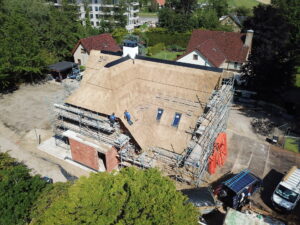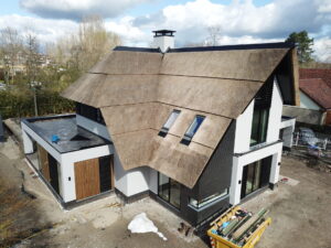 Het dak is afgewerkt met riet, waarin een optische lijn in is verwerkt. De dakopstanden van de platte daken zijn afgewerkt met zwart zink, dat weer aansluit op het gevelstucwerk.